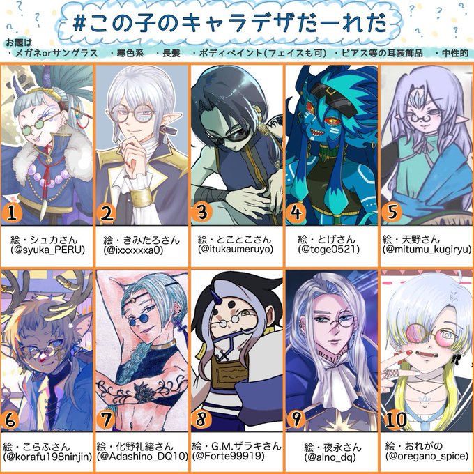 #この子のキャラデザだーれだ お声がけさせていただきまして、皆さんとキャラデザ当てっこゲームやろう!となりましたー!🥳✌️ 大人数!!🥺✨ 自分が描かせていただいたのは⑩番のお子さんです〜🥰✨ さて、おれがのが考えたキャラデザは何番の子でしょうかー!🙄 アンケート繋げるのでよろしく!