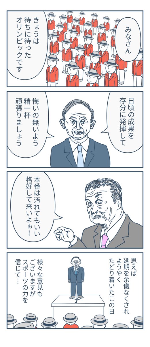 オリンピック初日の朝礼を描いてみました。 早いもので間もなく閉幕です。大変な時期のオリンピックでしたが、私はたくさん感動をもらいました😊#4コマ #4コマ漫画 #漫画が読めるハッシュタグ #似顔絵 #森喜朗 #東京オリンピック #olympic #tokyo2020