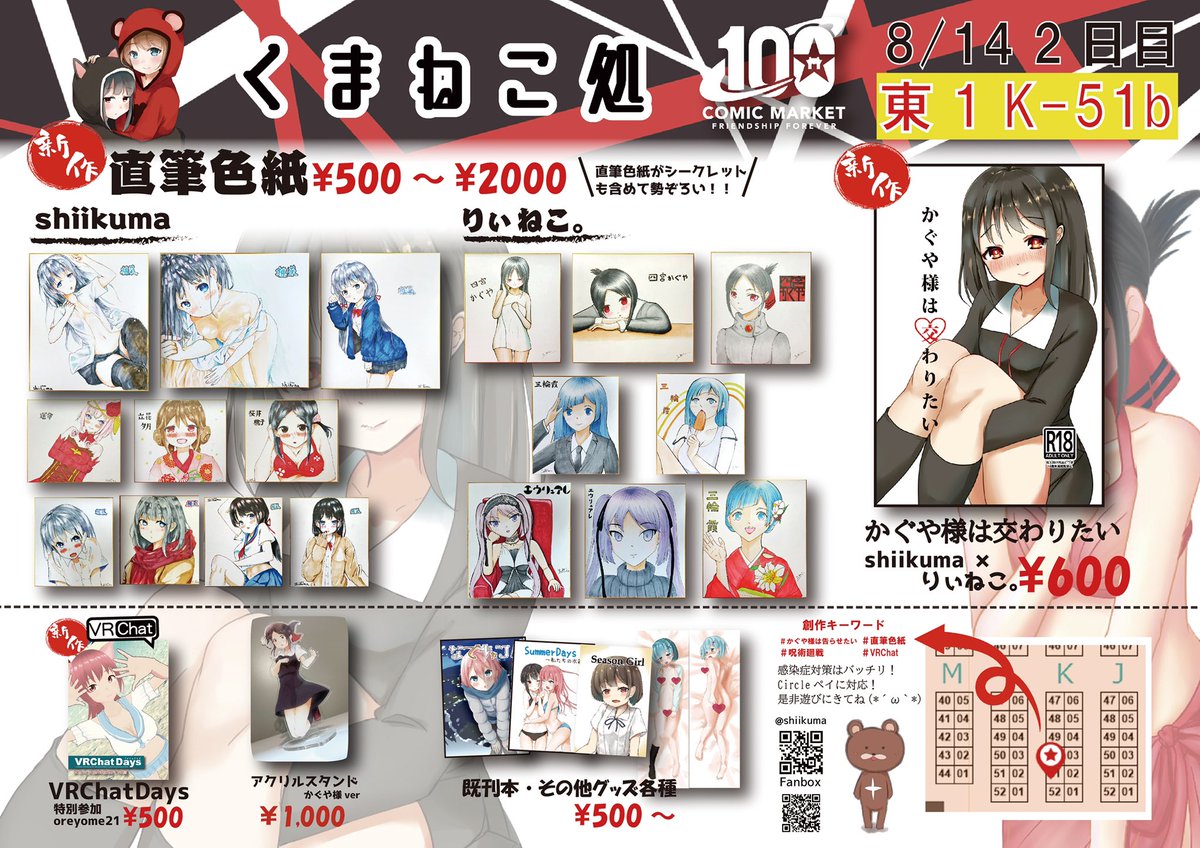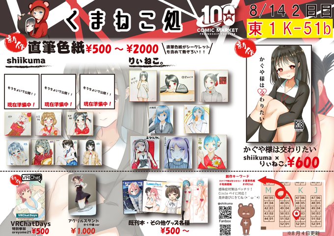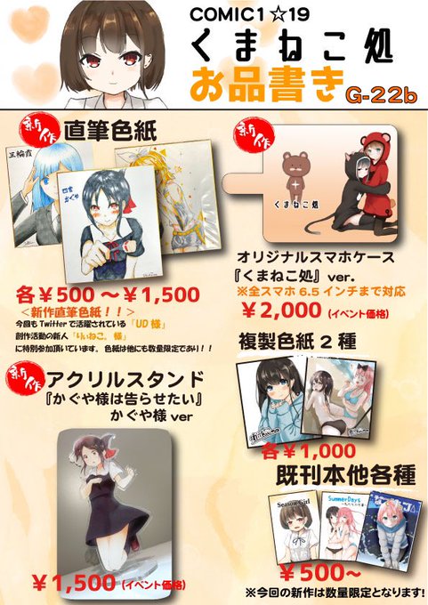 【くまねこ処】 いよいよ明後日、開催のコミ1(G-22b)に参加致します! 直筆色紙・スマホケース・アクリルスタンド(かぐや様)の3つが今回の新作となります! 他にもお蔵出しも用意してます! 数量限定ですので是非( ^ω^ ) #かぐや様は告らせたい #コミ1 #お絵描き好きさんと繋がりたい #COMIC1