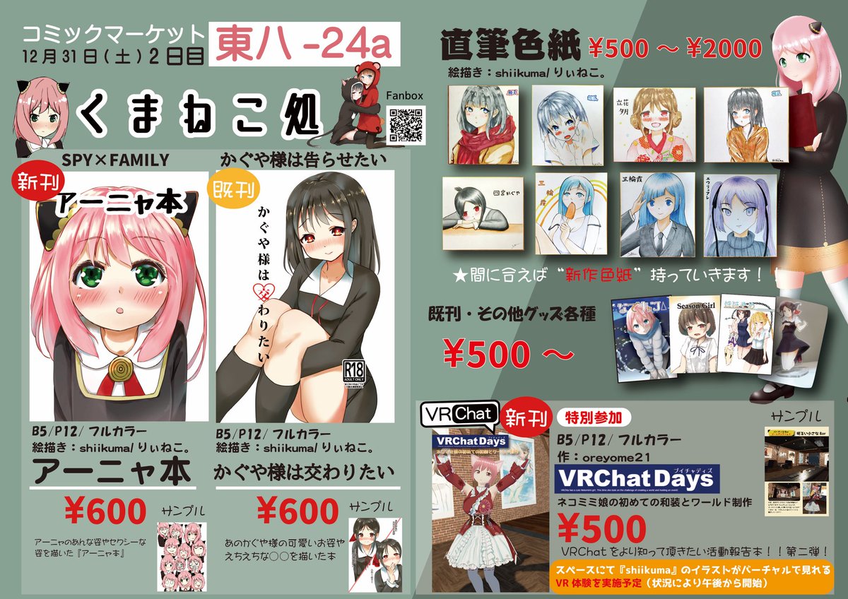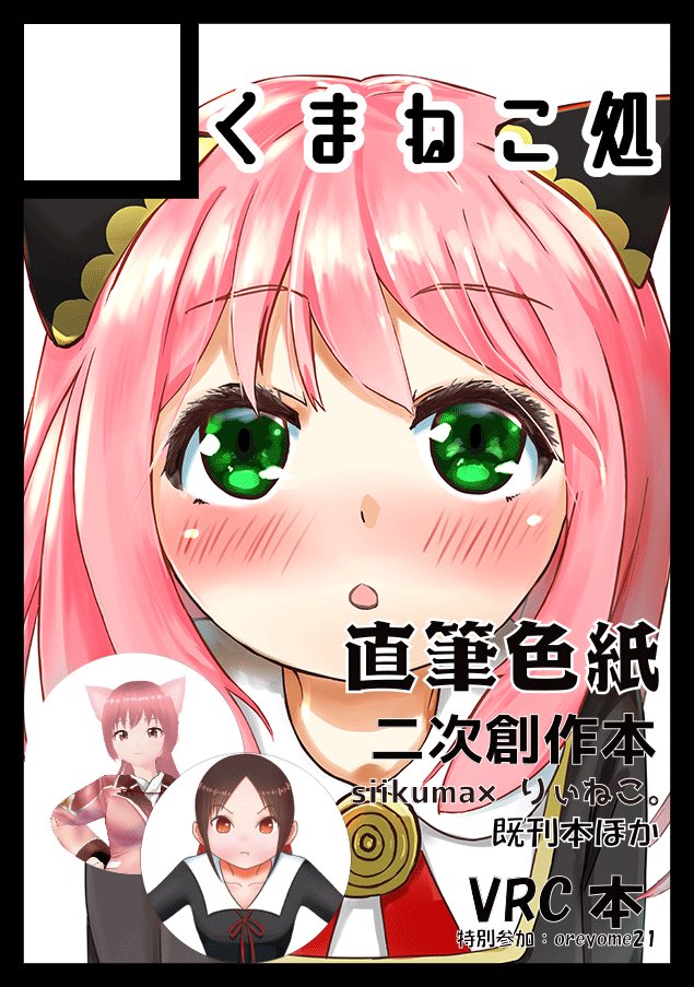 【くまねこ処】 本日開催の大阪コミトレに参加いたします! 冬コミ時に頒布したアーニャ本、VRChatDays、直筆色紙、他既刊、になります!大阪コミトレとしては新作扱いとなります! 是非お越しくださいませ! #こみトレ41 #VRC #SPY_FAMILY #かぐや様 #イラスト好きさんと繋がりたい @shiikuma