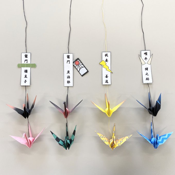 1 31 折り鶴・鬼滅 折り鶴で鬼滅をイメージして作ってみました! 折り紙の柄、ネームなど全てオリジナルで、OTの時にPCを使って作りました。 上の鶴は髪色(上下逆)、下は着物の柄。 #おりがみ #鬼滅 #折り鶴 #ペーパークラフト #Origami #kimetsunoyaiba #papercrane #OT 21/05/13 18:03