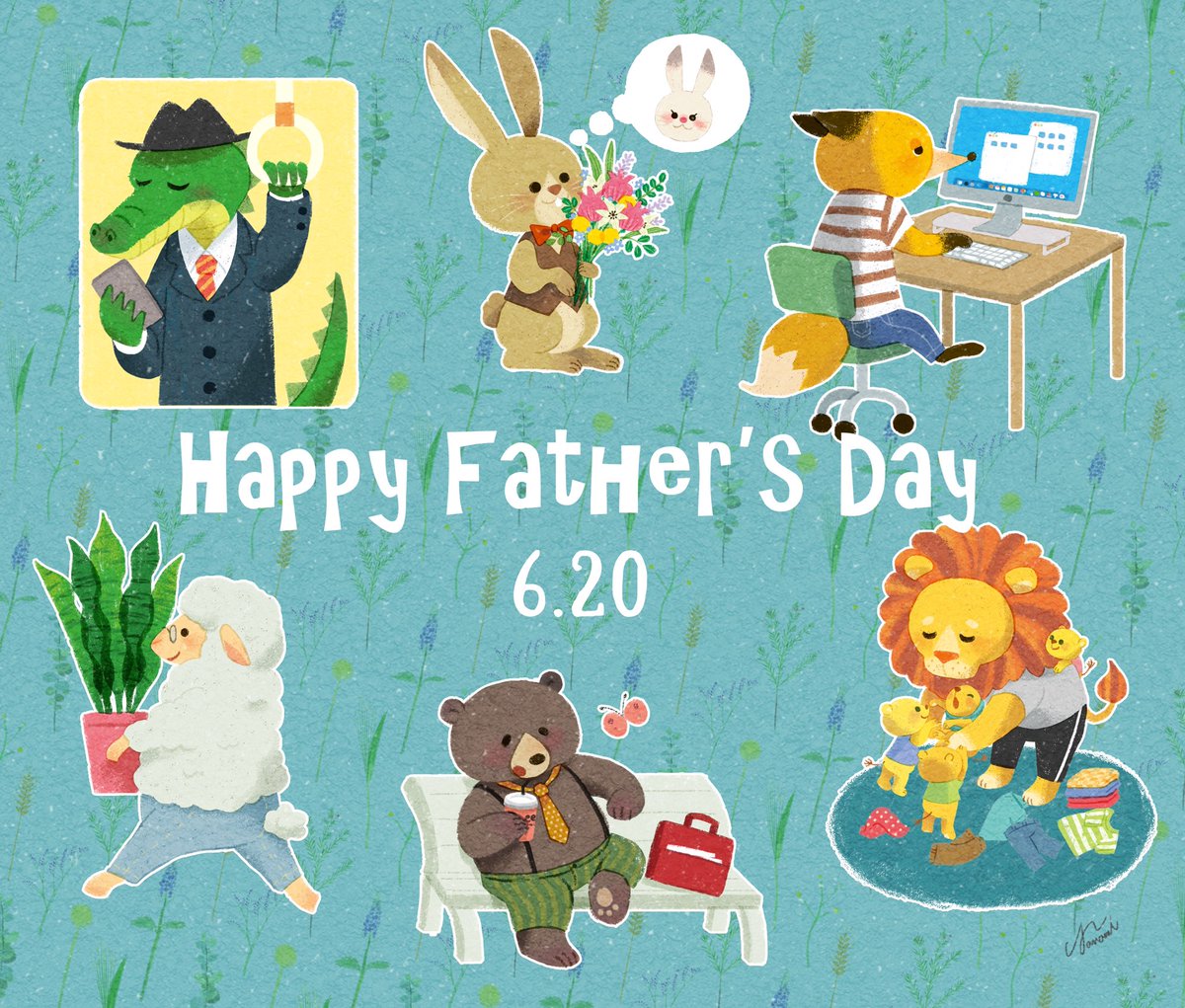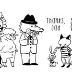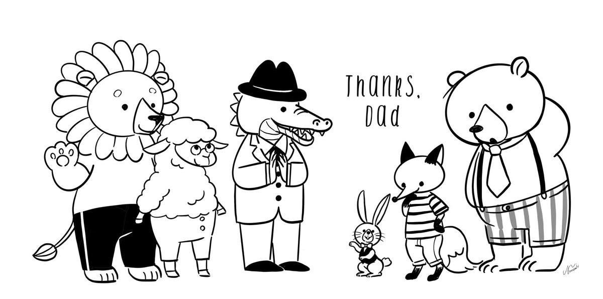後日談的なイラストも載せておきます🦁🐏🐊🐰🦊🐻 1週間同じイラストを何度も失礼しました、お付き合いいただきありがとうございました🙇♀️ 動物キャラのサイズ感っていいですよね…好き❤️ 気付くと肉食動物が多くなってしまうw ️#父の日 #fathersday #fathersday2021 #イラスト #illustration