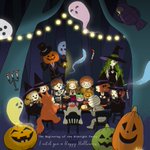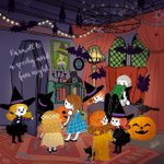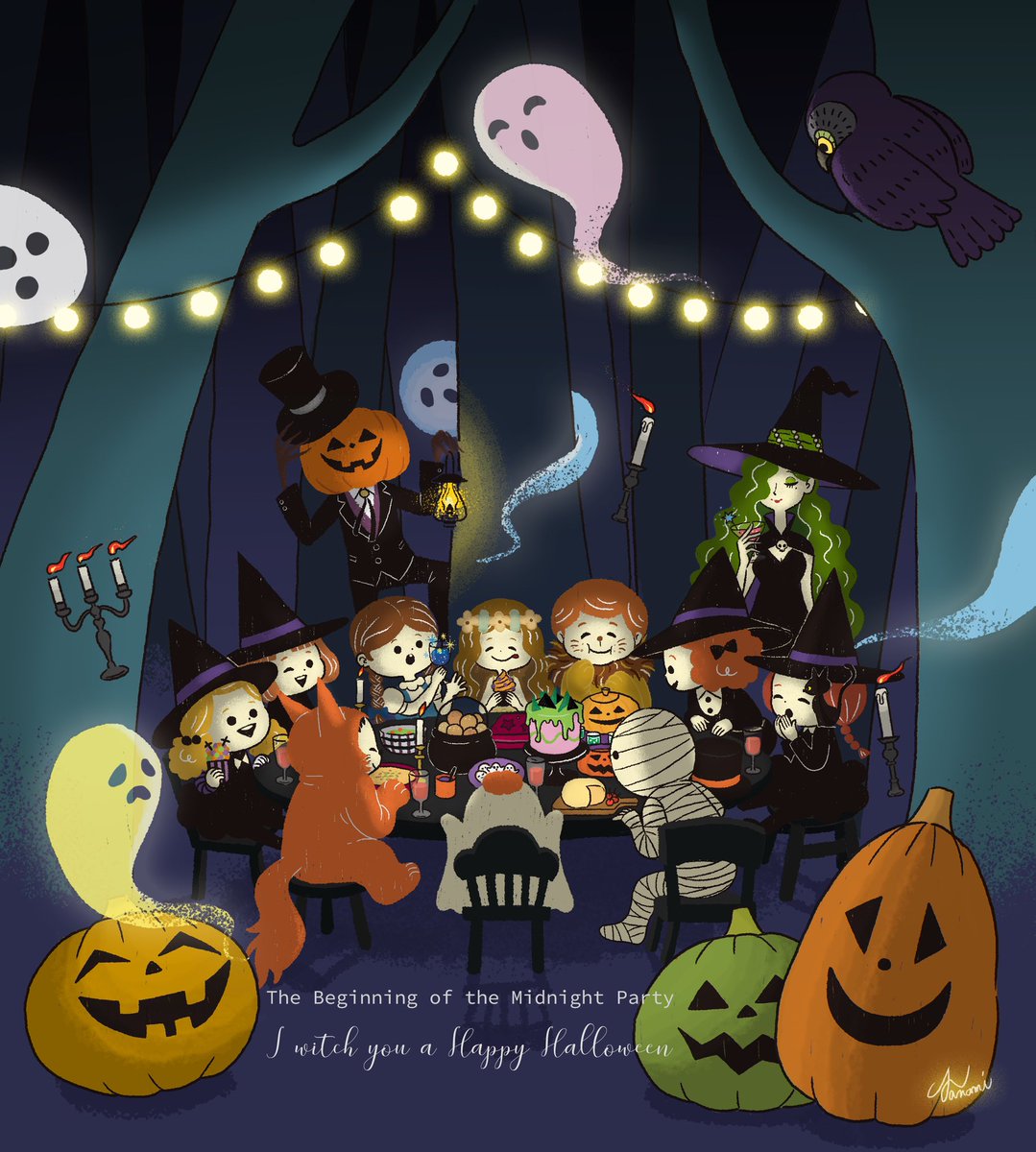 #HappyHalloween 🎃 ❾→ようこそ!不気味な夜のパーティへ!👻🎃🦉🌙皆勢揃い! 大鍋入りのパン、かぼちゃ頭のスープ、おばけクッキー、不気味なケーキなどがテーブルに並んでいます🍴 → #小さな魔女シリーズ #ハロウィン #イラスト #illustration #ハロウィンイラスト展示会2021 #halloween2021