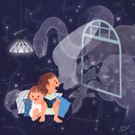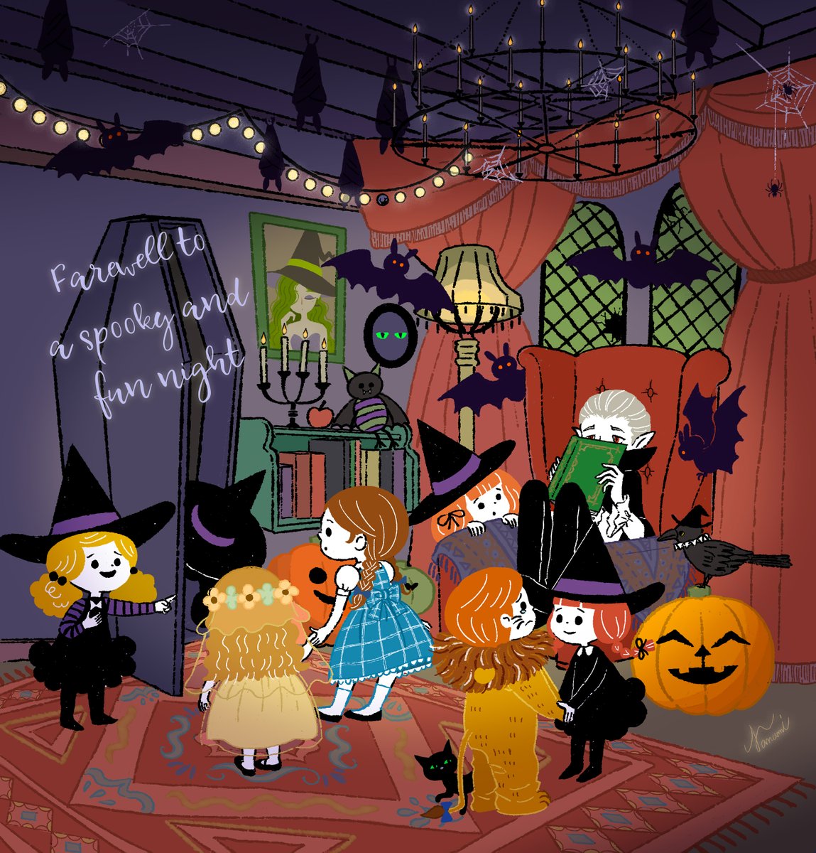 ➓→最後は吸血鬼の館へ…ちょっとお邪魔します! そこには恥ずかしがり屋の吸血鬼、沢山のお客さんにドギマギ💦 吸血鬼の部屋にある棺を通って人間は人間の世界に帰ります、せっかく仲良くなれたのに寂しいハロウィンの夜です🎃→ #小さな魔女シリーズ #Halloween2022 #ハロウィンイラスト展示会2022