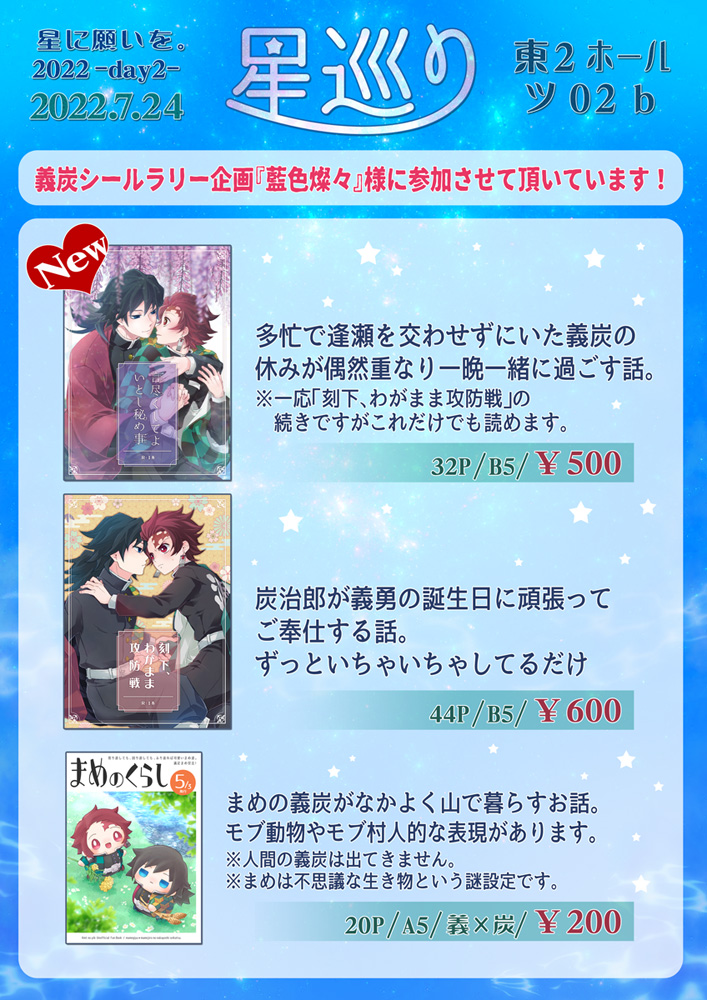 明日のお品書きとポスターです。東2ツ02b【星巡り】 新刊あります!!!(通販ec.toranoana.jp/joshi_r/ec/ite…)本人もいます。よろしくお願いします🙇 また義炭シールラリー企画『藍色燦々』様(@gytn_onri)に参加させて頂いております!素敵な企画本当にありがとうございます…! 楽しみで足が震える🥺