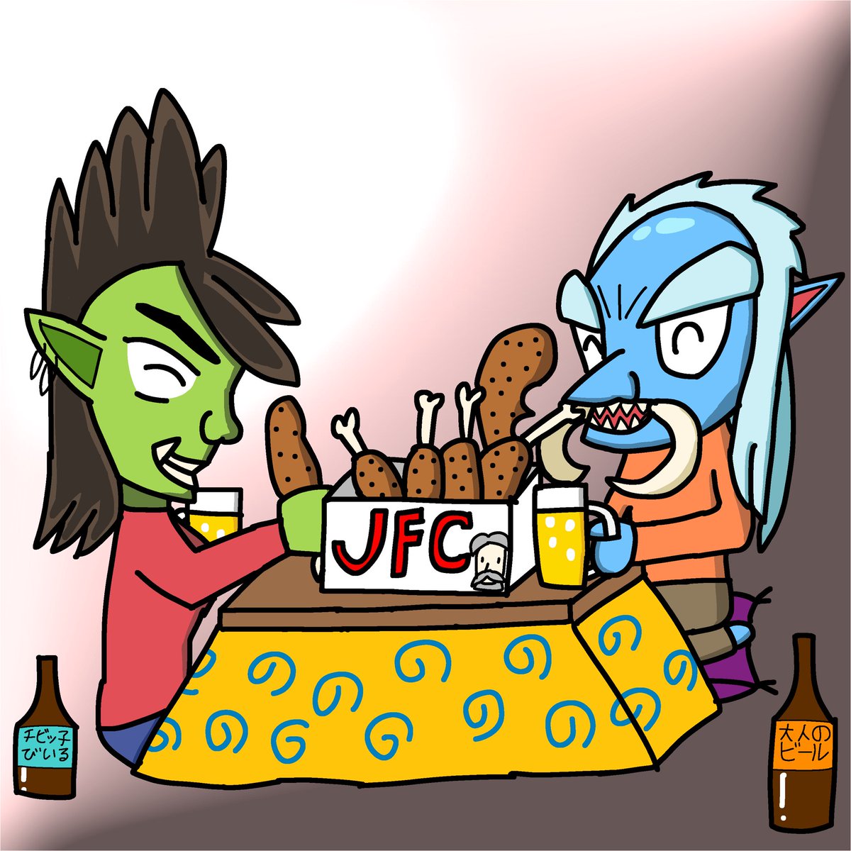 2 14 チキンを食べるロカラとブルカンの絵を描きました。 ハースストーンを題材にクリスマスっぽい絵を描こうとしたらこうなったんだ信じてケロ 21/12/04 03:13