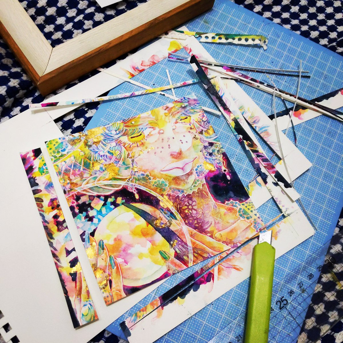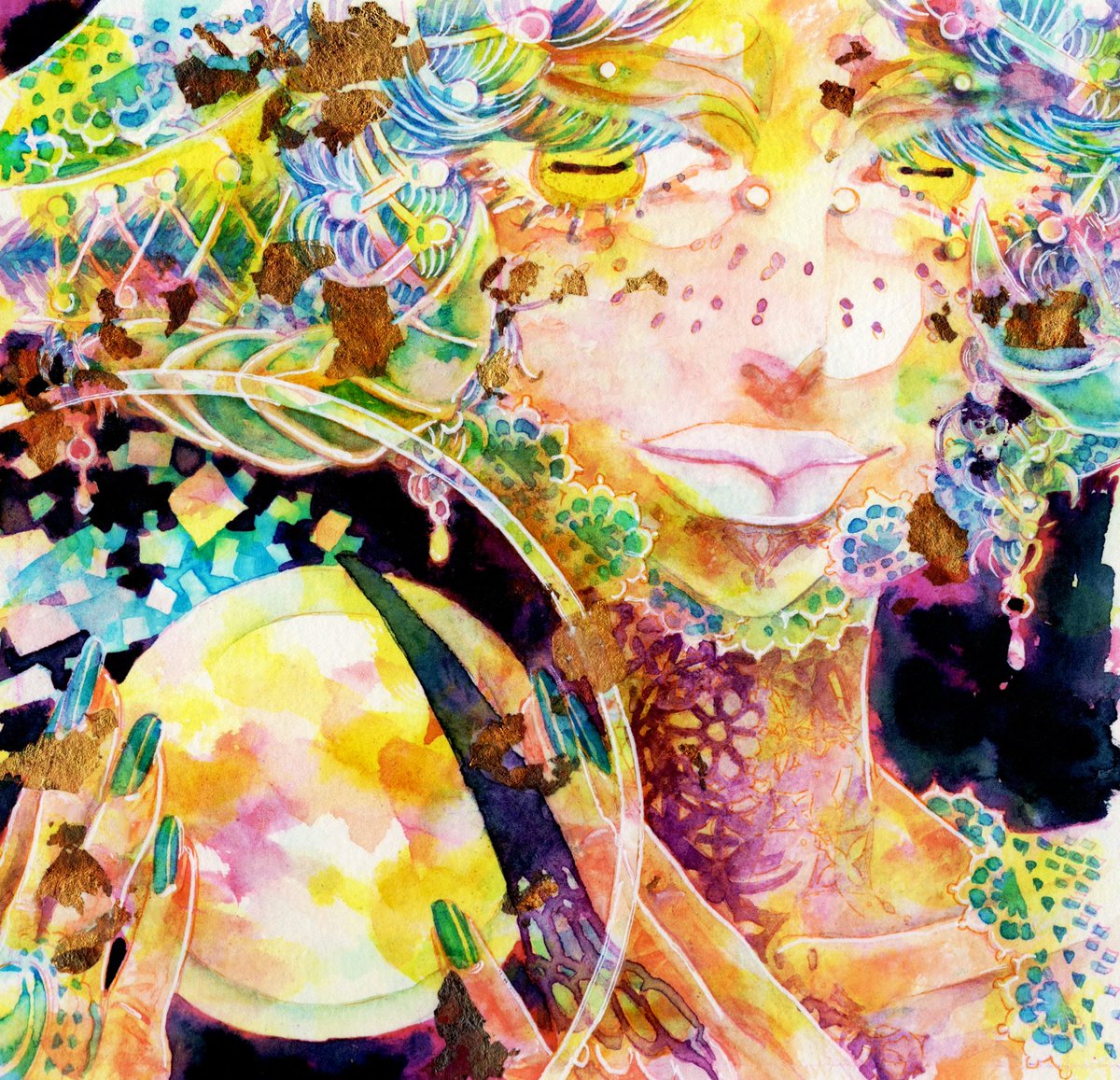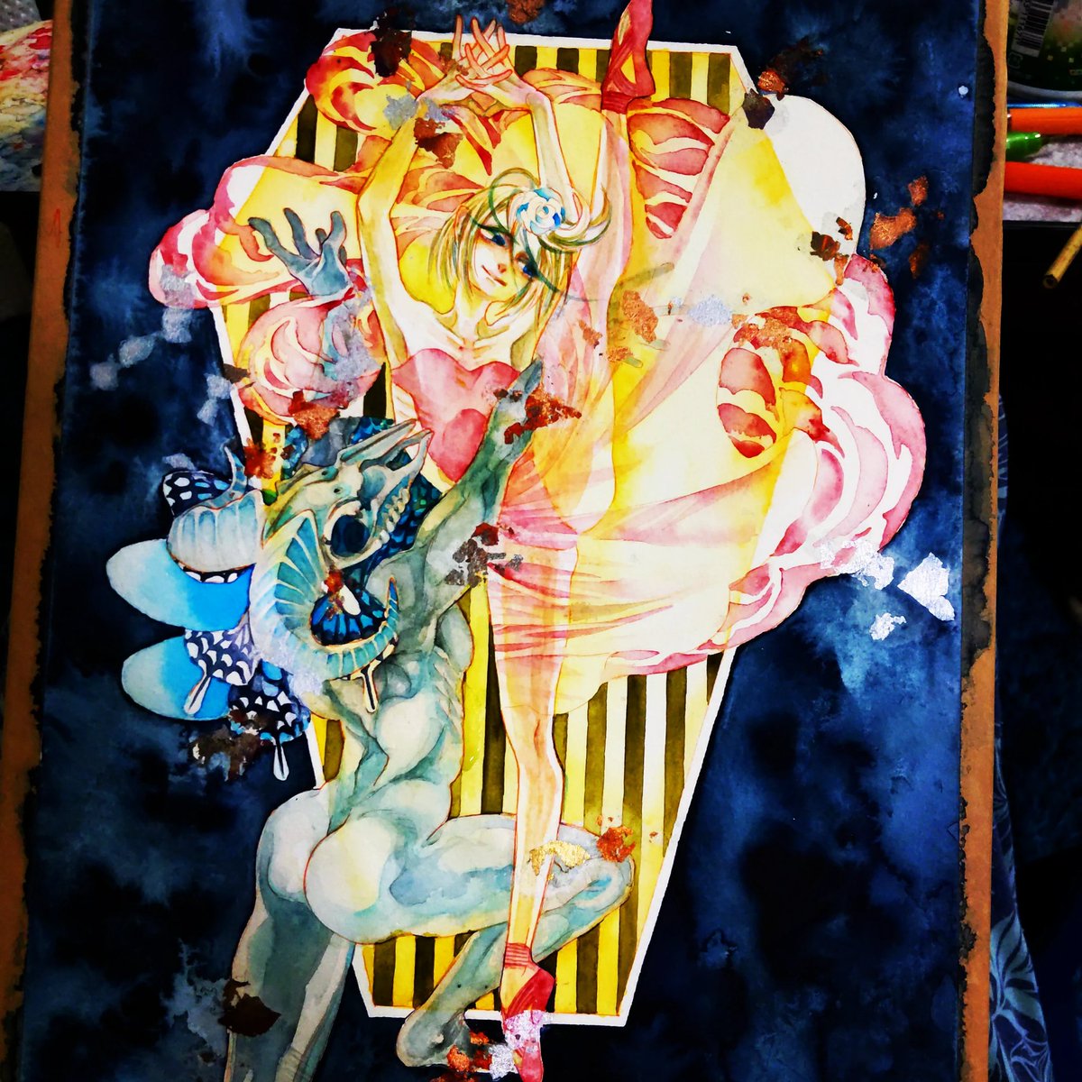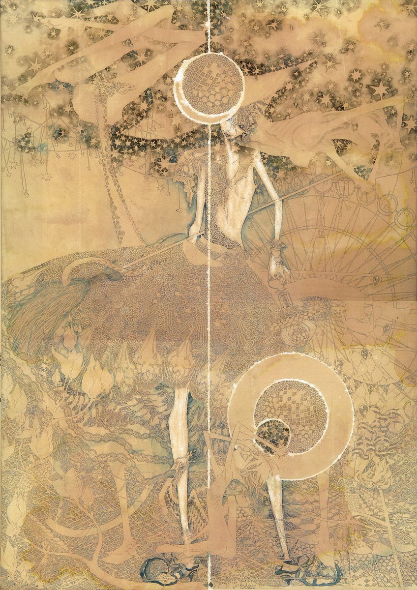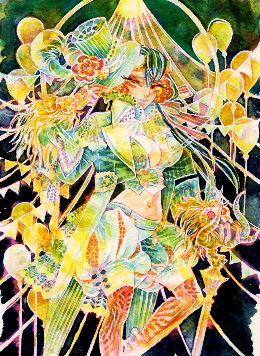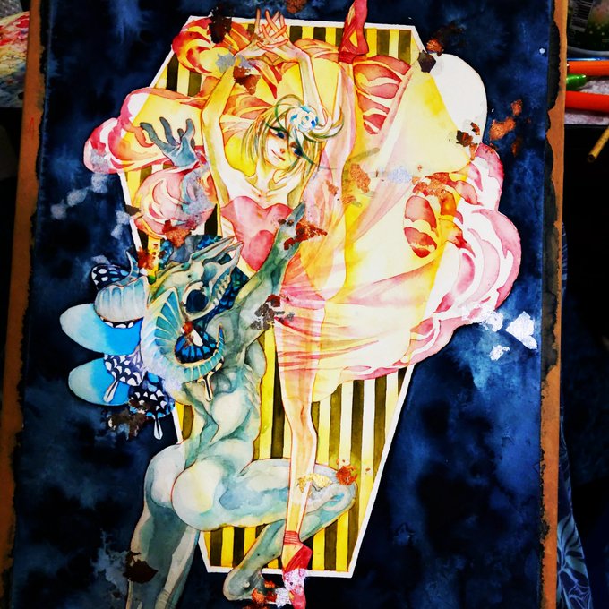 🎪新刊サンプル🎪『Witch’sPast#7』 フルカラー/A5/32ページ サーカスをメインテーマとした水彩イラストまとめ本です。 表紙はイメージです。金色の紙に白押ししてRGBカラー印刷しています。 7/20~25銀座展示にあわせ発行します。 pixiv.net/artworks/99845… 通販 alice-books.com/item/show/3331… #佐口想