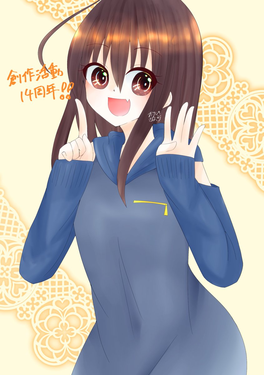 創作活動14周年を迎えました! お絵描き自体は物心ついた頃からなので多分22年くらいです!!! 去年と同じうちの子の知心ちゃんでお祝い🎉🎉🎉 衣装いい加減ちゃんと決めようね(これは肩出しが好きだから描いたみたいなとこある) #さなーと #イラスト #オリジナル