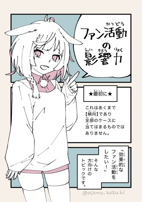 「効果的なファン活動」について描きました。 これは拙作に限らず、おおよそ世に出ている作品全般についてです。(かなり端折っていますがご了承ください) 要約すると「公式がファンの存在を認識できるように動くと効果的だよ」という内容です。