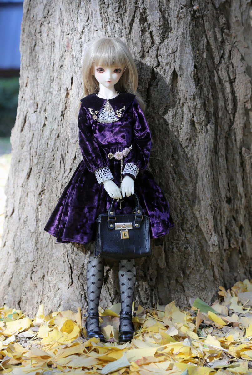 #今夜のドール撮影120分一本勝負 お題(もたれる) 待合せなかなか来ないので銀杏に持たれて待つ六花ちゃん