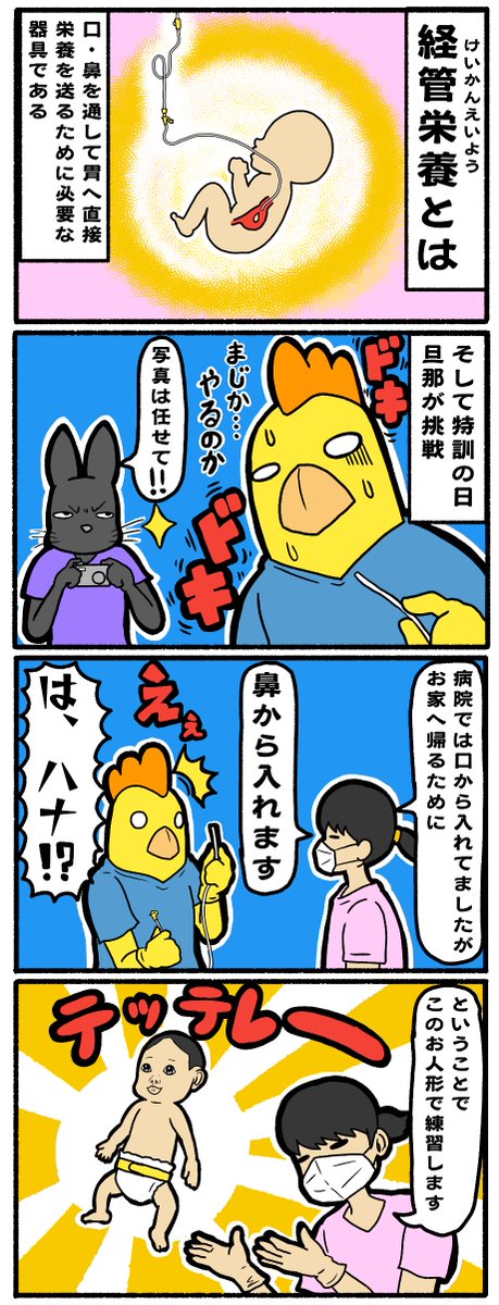 13トリソミーの娘とお家に帰る【3話】 oshakuro.com/2022/03/14/blo… 経管栄養の特訓をすることになった旦那🐔 その内容は、赤ちゃんの鼻から胃まで 栄養チューブを通すというもの・・・😨 まずは人形で特訓することに😅 #エッセイ漫画 #13トリソミー #育児漫画 #育児絵日記 #漫画が読めるハッシュタグ