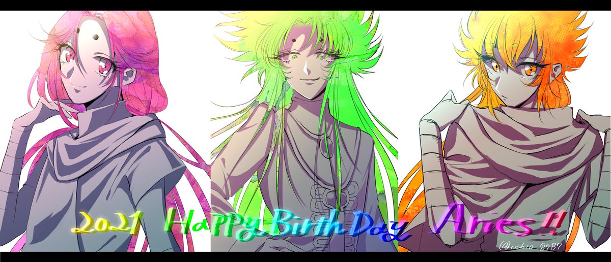 #牡羊座のムウ生誕祭2021 #牡羊座のシオン生誕祭2021 #牡羊座の貴鬼生誕祭2021 遅刻したけどおたおめーーー!🎉💝✌️💕✨ 毎年ムウしか描いてなかったから今年は3人! らきちゃん来年こそ描く😭