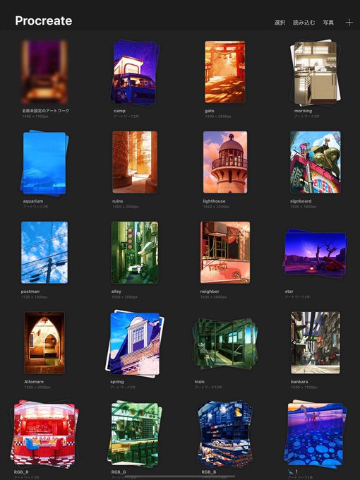 ほぼ今年に入ってからprocreateを使い始めたんですが、大分溜まって来ました😚(左上は描き始めたばかりなのでぼかし) サムネでみた時に同じ色が続かないようにとか、微妙に意識しています。 こうやって見ると、寒色系→暖色系に寄ってきていて面白い