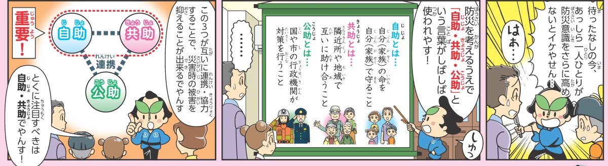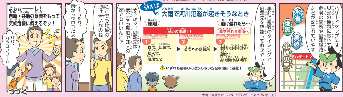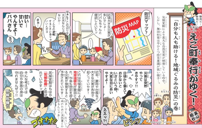 9月は #防災月間 です。 センター情報紙えこっとOSAKA連載中のマンガ「えこ町奉行がゆく!」のバックナンバーから「『自分も人も助ける!地域ぐるみの防災』の巻」をご紹介します! 他のバックナンバー(PDF)はこちら→osaka-midori.jp/ondanka-c/mang… #漫画が読めるハッシュタグ