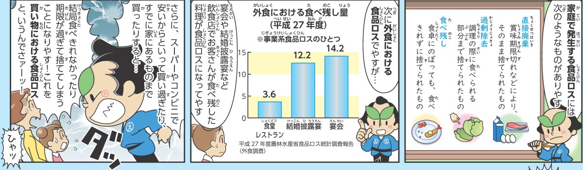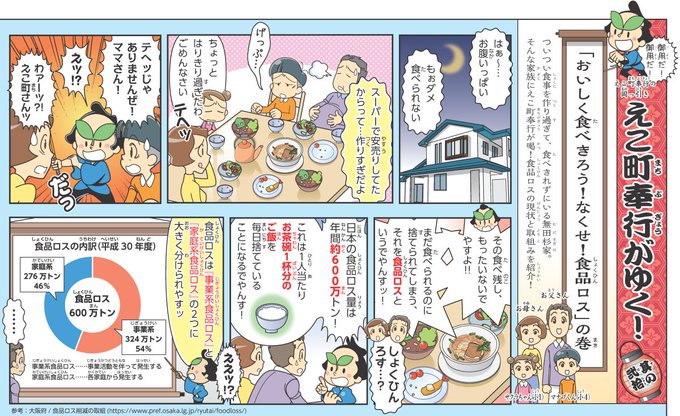 10月は #食品ロス削減月間 です。 センター情報紙えこっとOSAKA連載中のマンガ「えこ町奉行がゆく!」のバックナンバーから「『おいしく食べきろう!なくせ!食品ロス』の巻」をご紹介します! 他のバックナンバー(PDF)はこちら→osaka-midori.jp/ondanka-c/mang… #漫画が読めるハッシュタグ