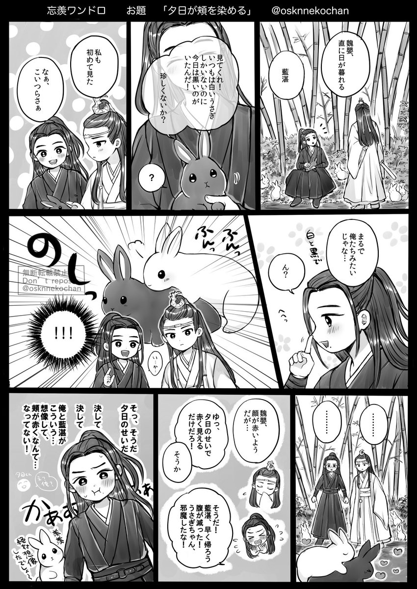 お題【"夕日が頬を"染める】 頬が赤いのも、耳が赤いのも、夕日のせいにして誤魔化しちゃう知己 いつか誤魔化さず、そのままいい雰囲気になっちゃう…といいね🐰🌟 #忘羨ワンドロワンライ #忘羨