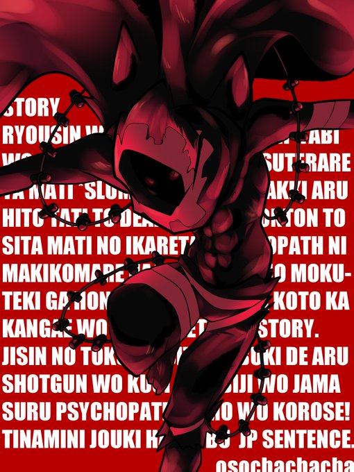 ガトミンチ ・スラムでレストランを営む肥満体のシェフ ・顔が見えないほどシェフ帽を深く被っている ・挽肉機を改造した銃火器を腹に乗せて扱う ・弾丸は骨や歯が混じった粗挽きソーセージ弾。実弾ほど威力はないが作成が容易で、弾切れになることがない ・呼吸がうるさく、汁ベタベタ #創作 #落書き