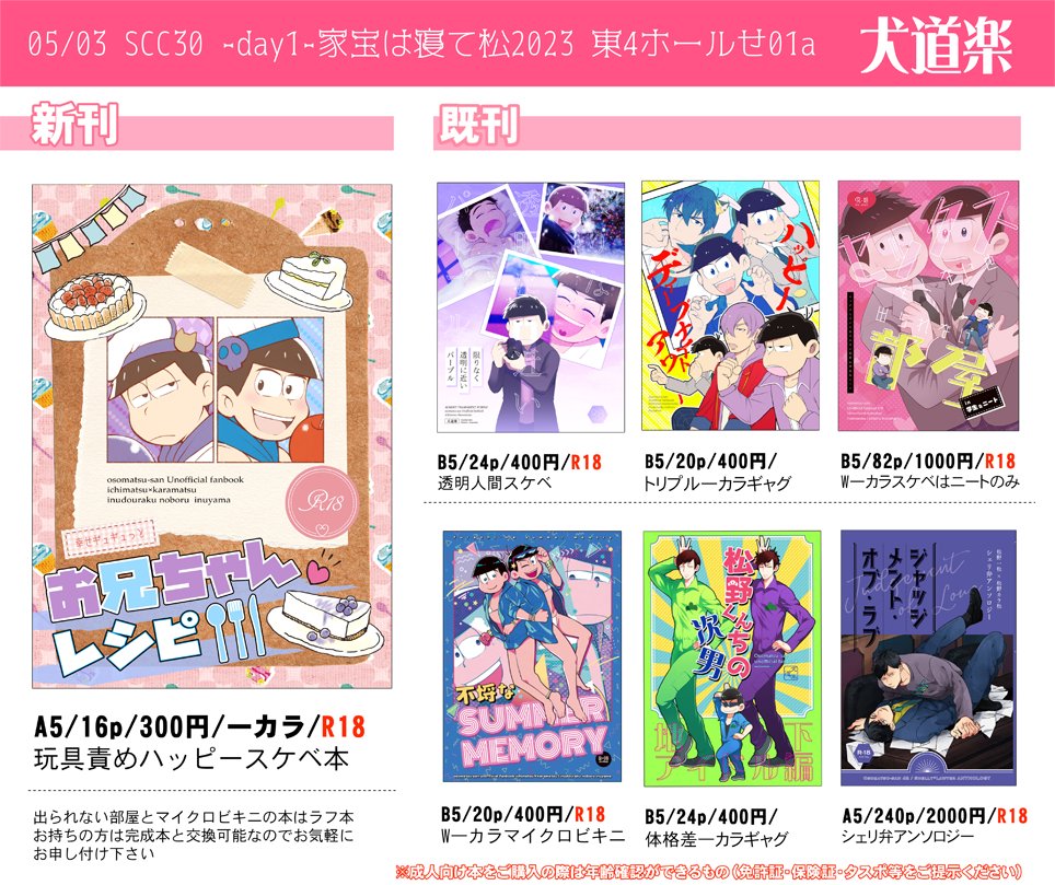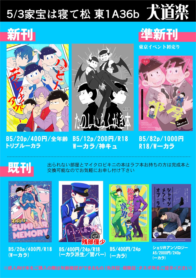 明日のお品書きこちらになります!!明日はよろしくお願いしますー!! 【5/3 家宝は超寝て松2023】 お品書き | 犬山 #pixiv pixiv.net/artworks/10774…