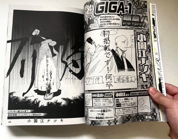 63 294 5/2発売のジャンプGIGA2022春号にて、新作読切『フリ侍』と手塚賞準入選受賞作『煩悩僧正』が掲載されます。 この2作がデビュー作となります、よろしくお願いします、、! 22/04/08 18:45