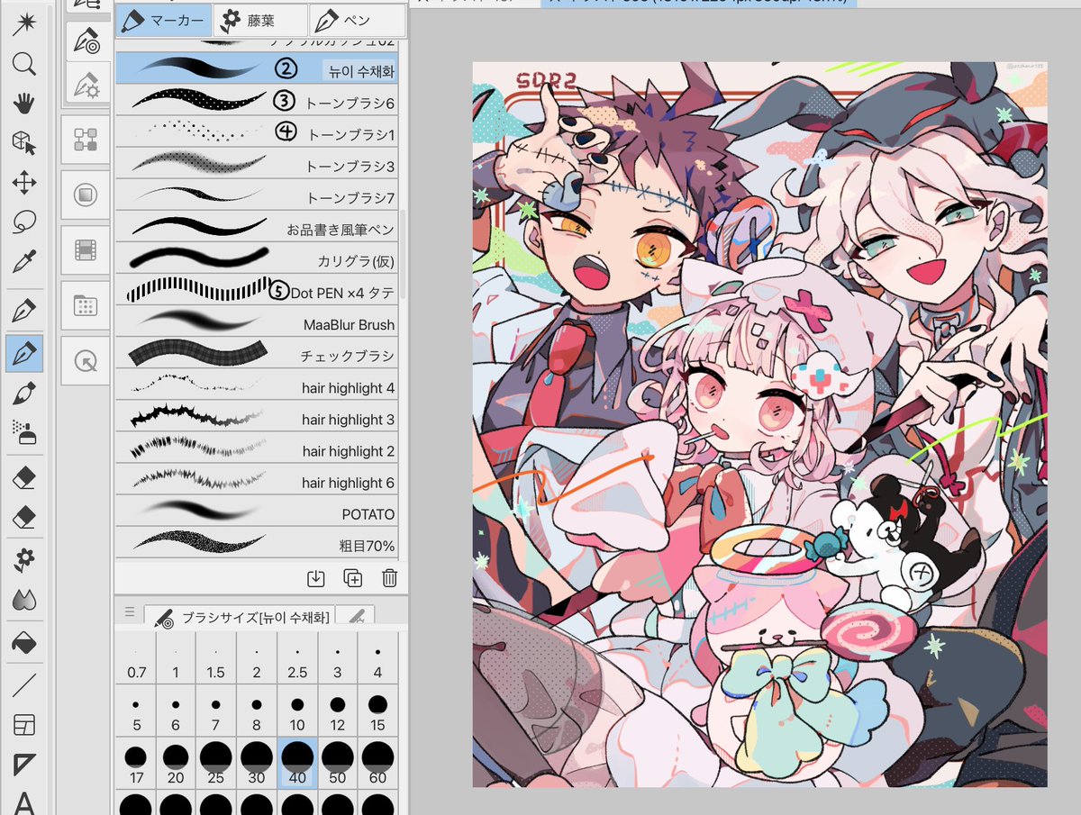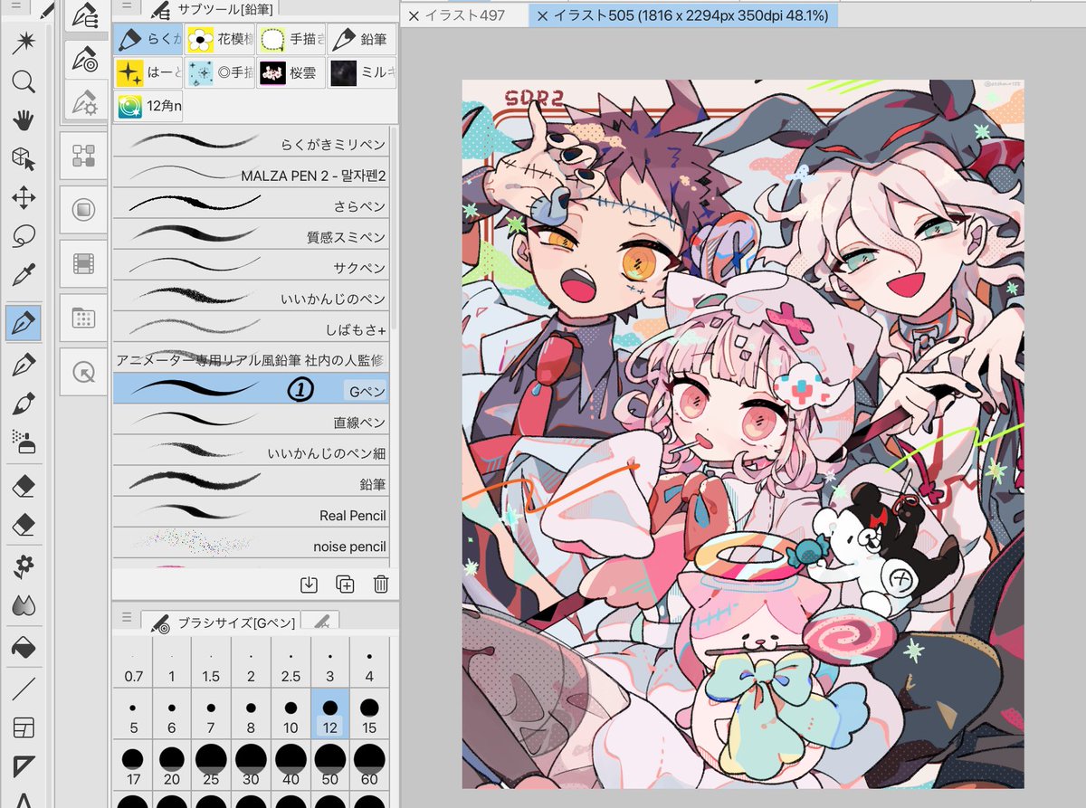 使用ブラシは画像の①〜⑤になります! ①はデフォルトで入ってるGペン(カスタムなし)です。ほぼこのペンとバケツで塗って②〜⑤は仕上げ用に使ってます。