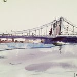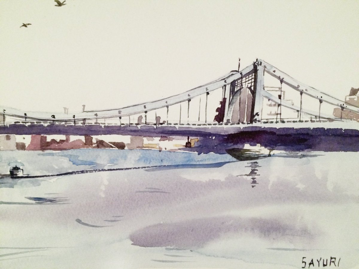 水彩で描いたレインボーブリッジ☺️🌉 水の揺らめく感じと建造物のくっきりした感じのコントラストが、描いていて楽しかったです! 船が2艘浮かんでいるのですが、見つけられるかな?🤔 #水彩画 #絵画教室 #絵描きさんと繋がりたい