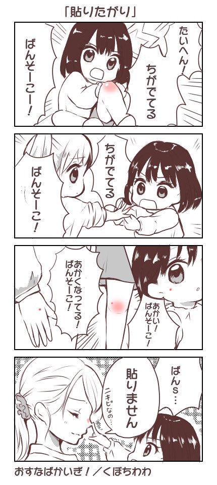 「貼りたがり」 こどもはすぐ絆創膏貼りたがるよねってお話です👧🏻 #創作漫画 #四コマ #4コマ #四コマ漫画 #マンガが読めるハッシュタグ #漫画が読めるハッシュタグ #育児漫画 #おすなばかいぎ