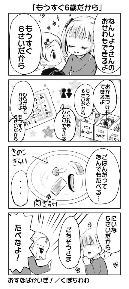 「もうすぐ6歳だから」 吹き出し大幅にミスってますがすいませんこのままいきます(;゚;ж;゚;)ブッ #四コマ漫画 #四コマ #4コマ #4コマ漫画 #創作漫画 #漫画がよめるハッシュタグ #マンガが読めるハッシュタグ #おすなばかいぎ