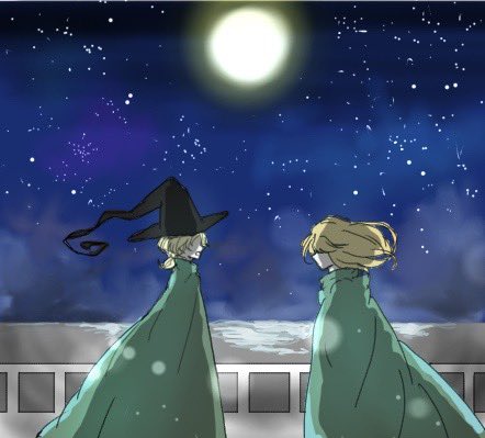 #彼と彼女の魔導書市05 会場四隅の元絵を担当いたしましたおすしです! 今回会場デザインのテーマが「ターフィオの聖地」だったので、1年生〜4年生までの2人の成長を描かせていただきました🥰 ちなみに会場ど真ん中は、柚香さんとneoちゃんが描いてくださったウユニ塩湖です💕
