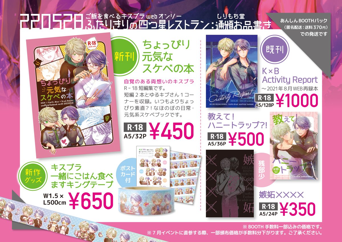 5月28日キスブラご飯WEBオンリー 通頒のご案内 BOOTH: osyamojihan.booth.pm 今回自宅発送のため、頒布物ページを在庫なし状態で公開しております。「イベント当日 AM10:00」に在庫をいれます。 以降 新刊サンプル等 こちらのつぶやきにつなげます。よろしくお願いいたします! #キスブラご飯