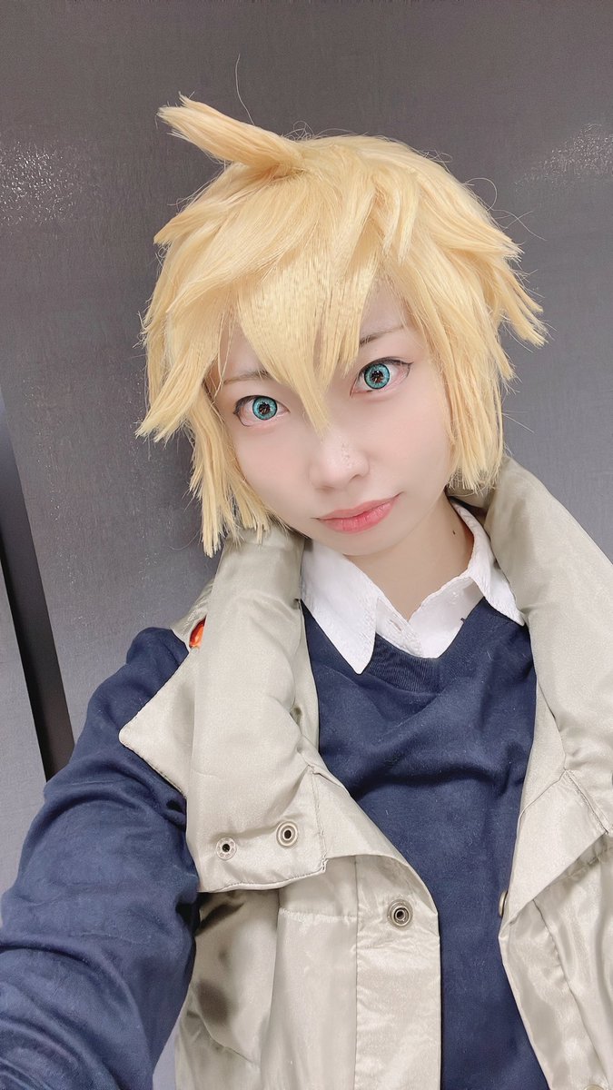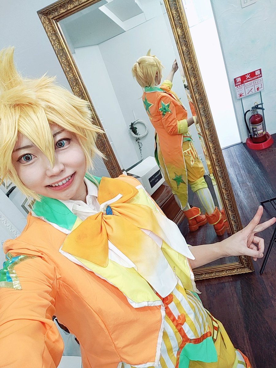 ワンダショのレンくんできたー!! お星様たくさんキラキラにしたよ!ストライプタイツ縫うの地獄だった😇 胸のリボンのグラデーション綺麗にできて満足〜!アイロンがけは明日の私が頑張る! #たまごの衣装自作部屋 #prsk_cos