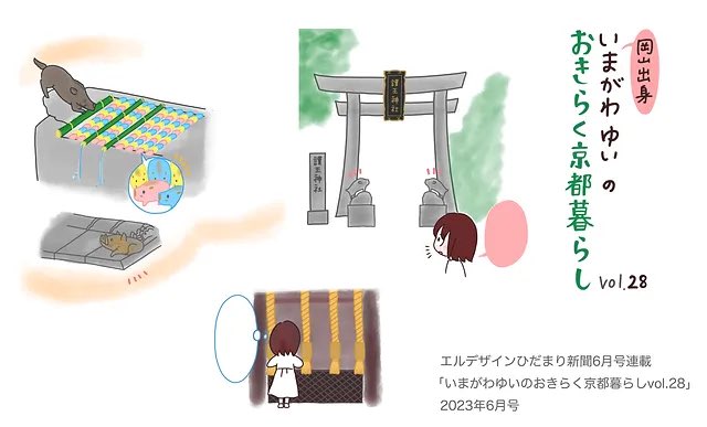 【お仕事】 2023年6月号のエルデザイン様フリーペーパーに「いまがわゆいのおきらく京都暮らしvol.28」を掲載いただいています。今回は京都の足腰にご利益のある神社について描きました。🐗(最新話は紙面のみで読めます。) バックナンバーは下記URLから読めます✏️ぜひー! smart.reform-ldesign.com/gallery/galler…