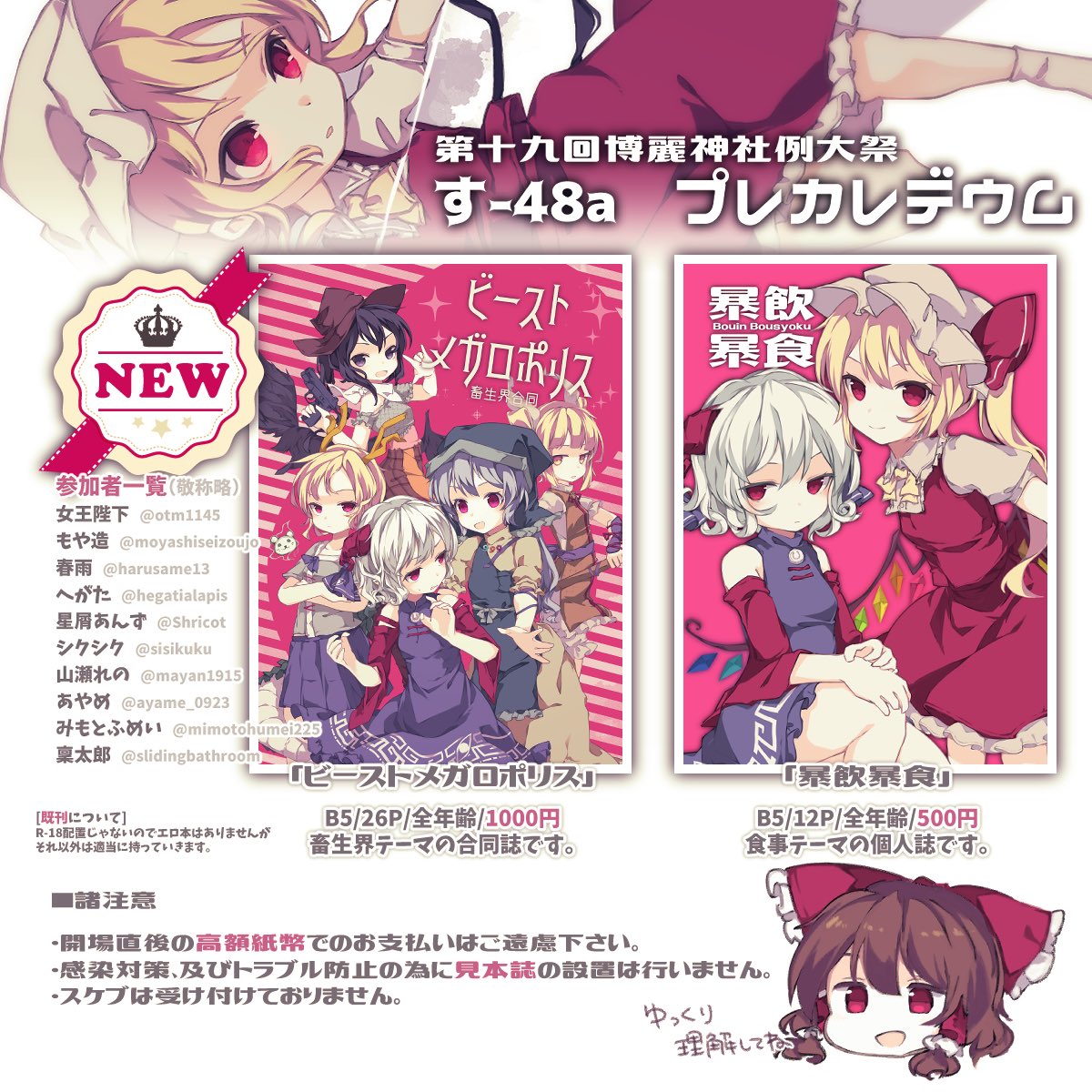 76 217 第十九回博麗神社例大祭のお品書きです。 す-48a「プレカレデウム」にてお待ちしております! 22/05/04 19:16