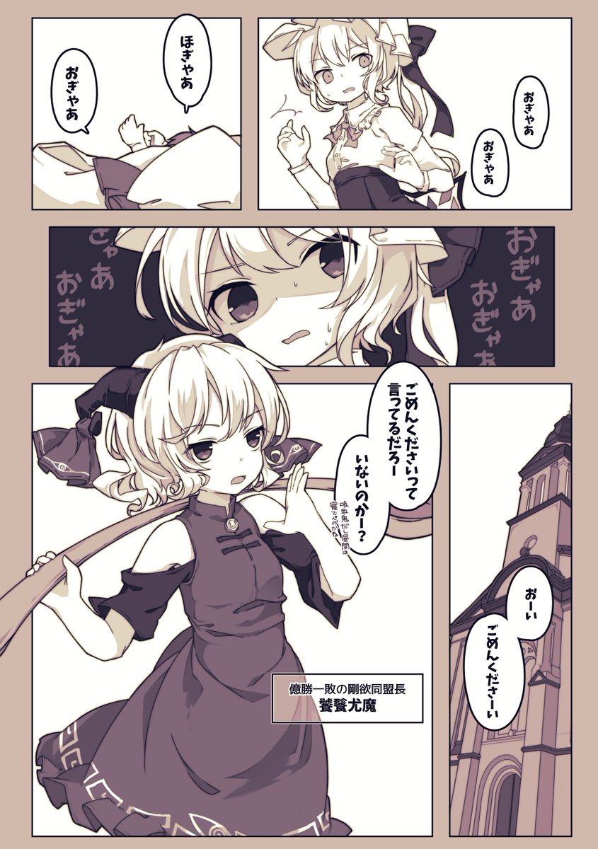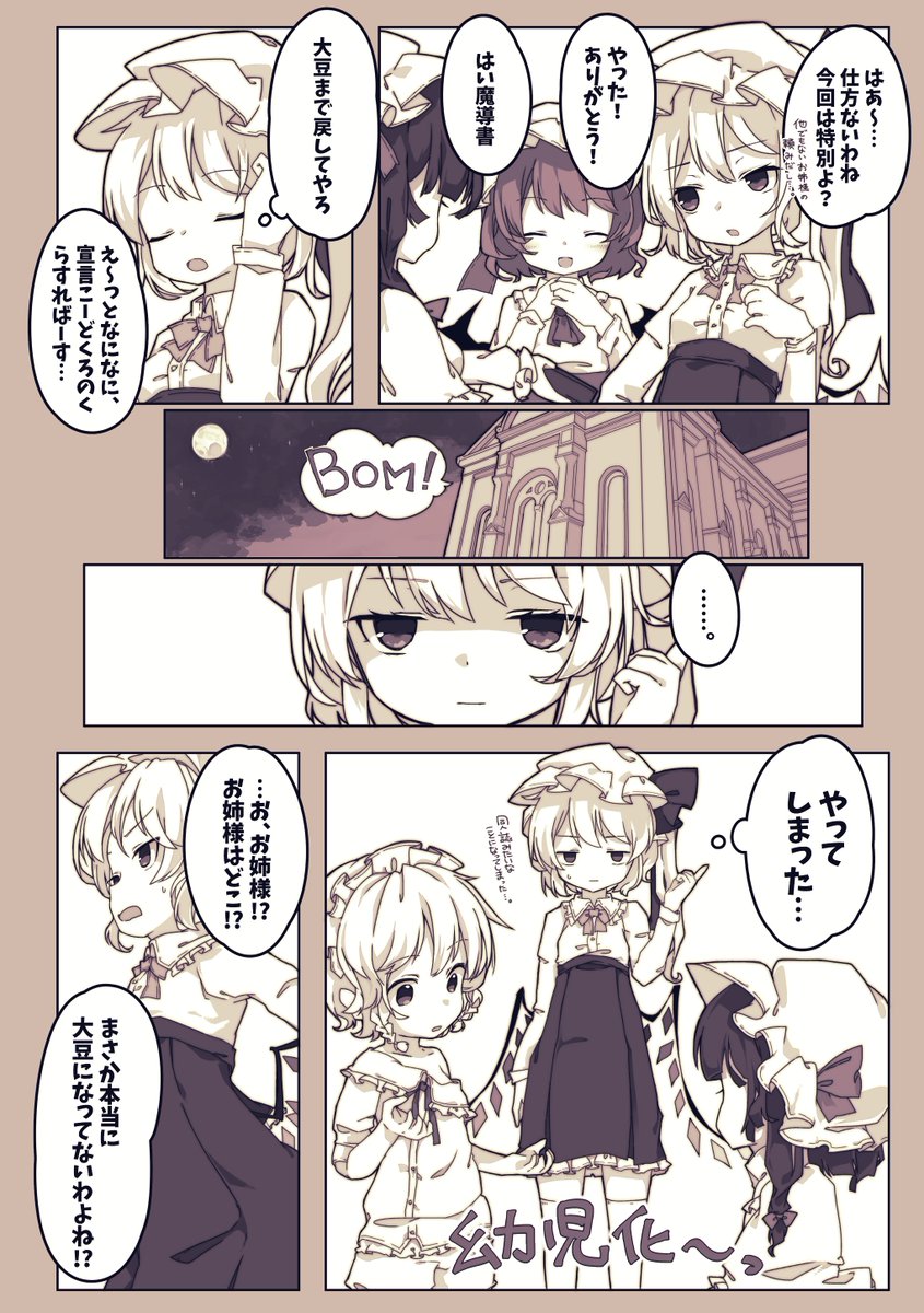 222 860 東方紅楼夢18の告知です。 「私がママになるんだよ!?」A5モノクロ/全年齢/20P(800円) フランドールが小さくなった紅魔館メンバーをお世話する話です。ロリ咲夜がぶん殴られかける場面がありますがそれ以外は大体平穏なほのぼのギャグ漫画です。 F-01b「プレカレデウム」にてお待ちしております。 22/10/02 21:35