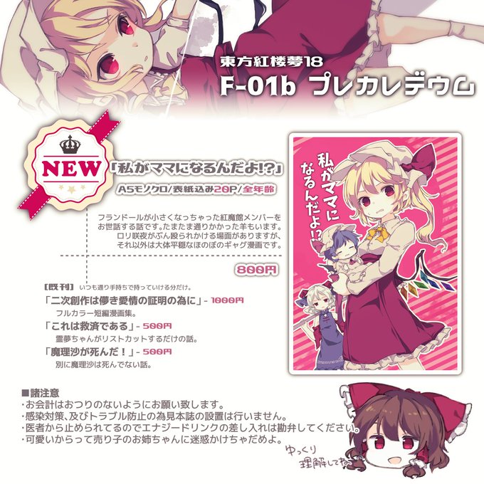 東方紅楼夢18の告知です。 「私がママになるんだよ!?」A5モノクロ/全年齢/20P(800円) フランドールが小さくなった紅魔館メンバーをお世話する話です。ロリ咲夜がぶん殴られかける場面がありますがそれ以外は大体平穏なほのぼのギャグ漫画です。 F-01b「プレカレデウム」にてお待ちしております。