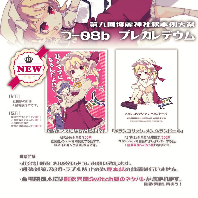 61 156 第九回博麗神社秋季例大祭のお品書きです。 紅楼夢新刊+会場限定コピー本になります。会場限定は碌でもない絵詰め合わせ+剛欲異聞Switch版ネタバレ感想という地獄を煮詰めた折本となっておりますので、覚悟をキメてからご購入下さいませ。 つ-08b「プレカレデウム」にてお待ちしております! 22/10/21 00:57