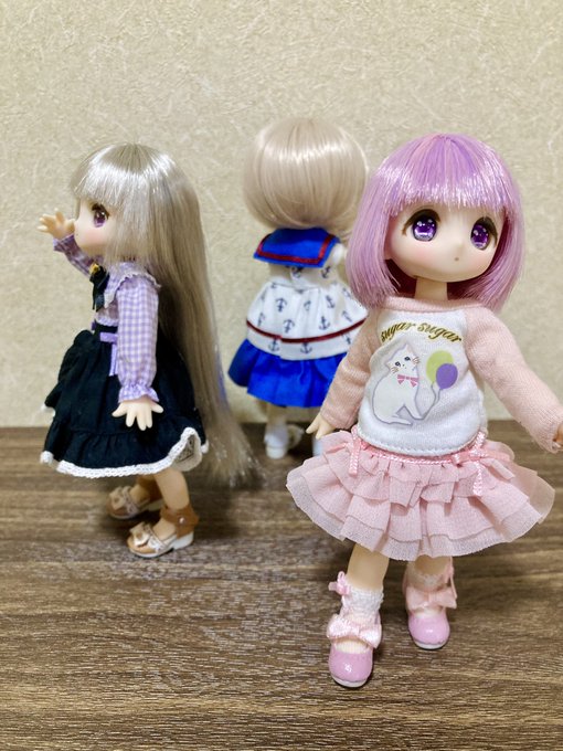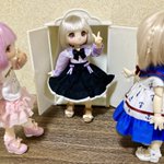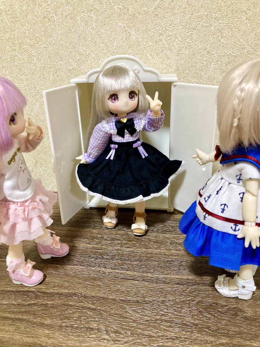#今夜のドール撮影120分一本勝負 お題【さがす】 3人「「「かくれんぼだー!」」」 さくら「ルルちゃん見ぃつけた」 さくら「ラーラちゃんはどこかしら……ん?」 ショコラーラ「正解は、クローゼットの中でしたー!」 みたいな4コマ風 #うちのこかわいい