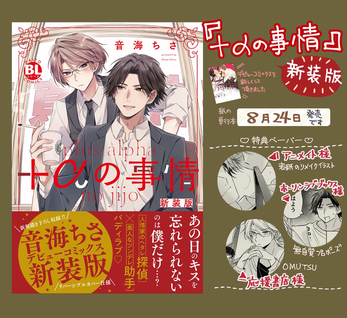 【🍒新装版出ます】 『+αの事情 新装版』amazon.co.jp/dp/4864956146 ヘタレ探偵×ツンデレ助手のバディBL🔍 音海の今はなき初コミックスをまさかの新装版にして頂きました。 新規描下ろしもあるのでお手に取って頂けたら幸いです…! ◆8/24発売です◆よろしくお願い致します🙇♀️webサイン会も有ます!