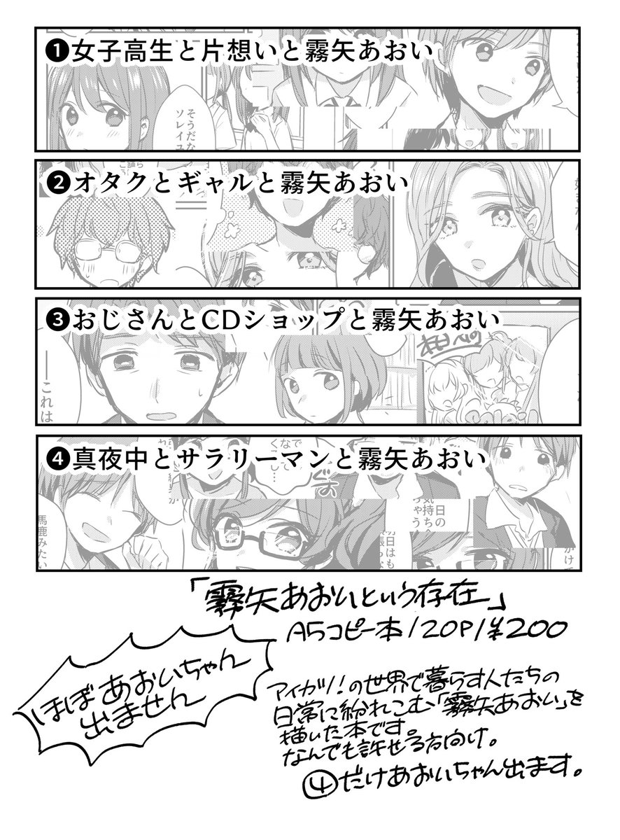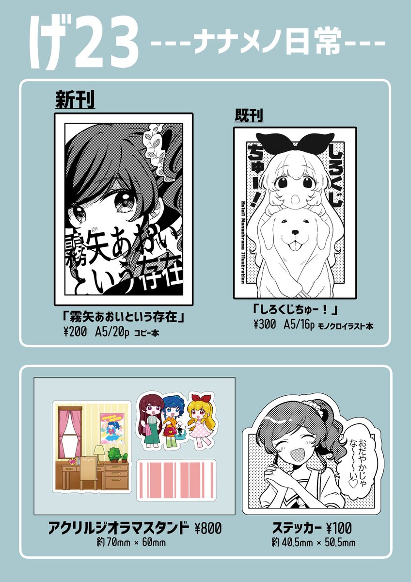 33 96 芸カ27【げ23】お品書きです! 新刊のコピー本は殆どオリジナルのモブキャラ男女が霧矢あおいについて喋ってるだけです。既刊は在庫僅少です。よろしくお願いします! #芸カ27 #芸カ27お品書き 22/07/09 20:16