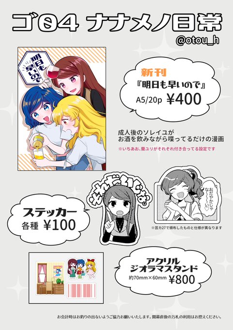 芸カ28【ゴ04】お品書きです!今回新刊のみで既刊の頒布はありません。ミニ色紙も描けたら持っていきたいな〜という気持ちです。 新刊サンプルはツリーにて(ステッカーも届き次第画像UPします) #芸カ28 #芸カ28お品書き