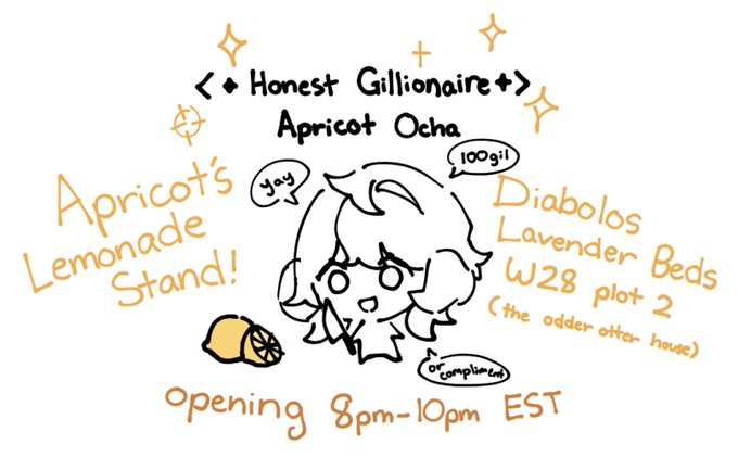for reaching the end of her journey for the honest gillionaire title, apricot is opening a lemonade stand 🍋 8pm-10pm EST today (august 6th) 🍋 diabolos, lavender beds, ward 28 plot 2 🍋 not art party lemonade is 100 gil each. or 1 compliment* *can also be insult see u there