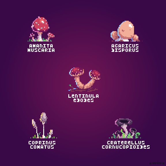 A #set of #fungi for 03/08 #pixel_dailies Finally was able to make some personal art haha @Pixel_Dailies #pixelart #pixelartist #mulfok32