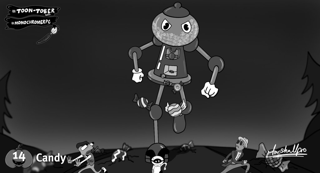 A GIANT CANDY MACHINE IS ATTACKING THE TOONS! Awesome work from Toontober Day 14: Candy. 🍬Done by: @Marshallpro3🍬 #inktober #digitalart #cartoons