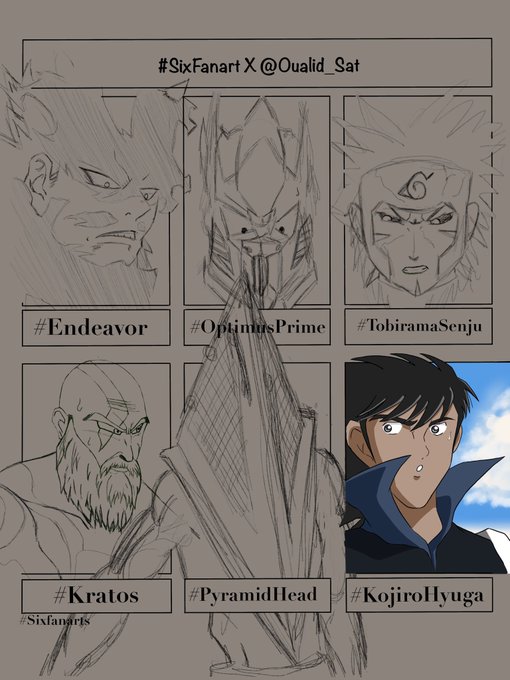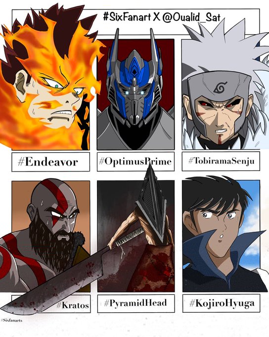 Fanart fini 😁 Enfin les 6 perso dans un seul dessin. 😁 Bcp de temps mine de rien, l'exercice est très sympa 👌. Rt&Fav 🙏 #sixfanartchallenge #SixFanarts #sixfanart #endeavor #optimusprime #tobiramasenju #kratos #ps4 #pyramidhead #silenthill #kojirohyuga #drawing