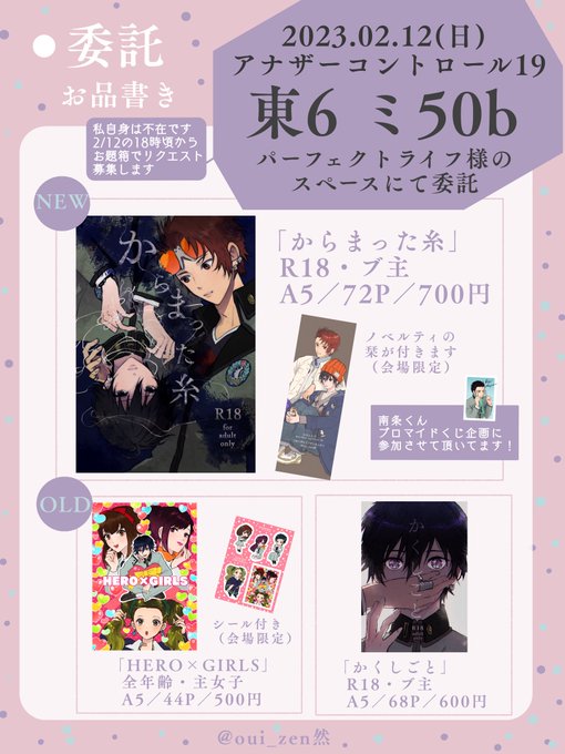 2/12(日)アナコン19委託お品書き 東6ホール ミ50b パーフェクトライフ・田中さしゃ。さん(@sssm2d)のスペースにて委託頒布していただきます。いつもお世話になり本当にありがとうございます!引用先は新刊サンプルです。追加のお知らせはこちらにツリーをつけていきます。 twitter.com/oui_zen/status…