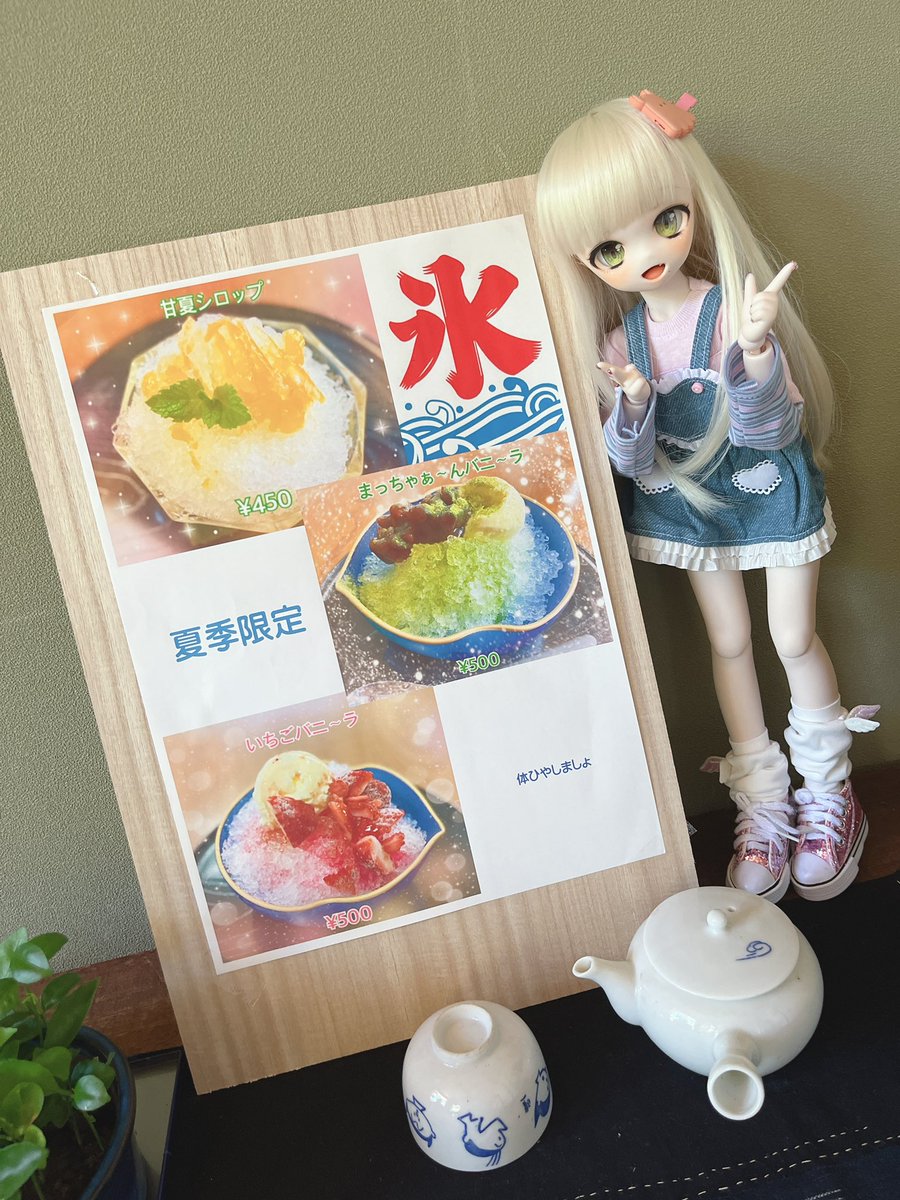 りりちゃんの夏休みの思い出🍉🏖 「ここの席は扇風機あたるから気持ちいいんだよ⭐︎」 「暑い日は かき氷がオススメっ!⭐︎」 #ふにゃほわっ子 #MDDはいいぞ #うちのこかわいい