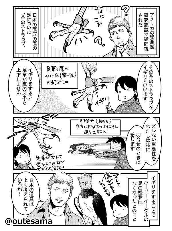 先日数年ぶりにお会いした吉田流Mさんとイギリの話をしたので、未発表で描いたことがあるな~と過去漫画。 アメリカの施設にて、ハーピーイーグルが足革で怪我をすることでの対策を探していたら、日本のイギリを見つけて…という流れでした。