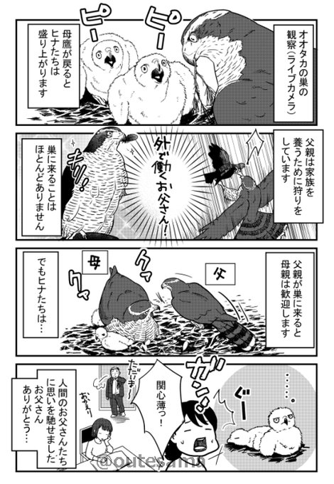 伊吹山のイヌワシをライブカメラで見ていて、あの父親は非常に優秀だとわたしは思っています。 巣だけを映すライブカメラで、出番の少ないオスの評価は低くなりがちだと感じているのですが、それはヒナにとっても同じだとオオタカで感じた一件を、以前描いて公開していなかった漫画で投下
