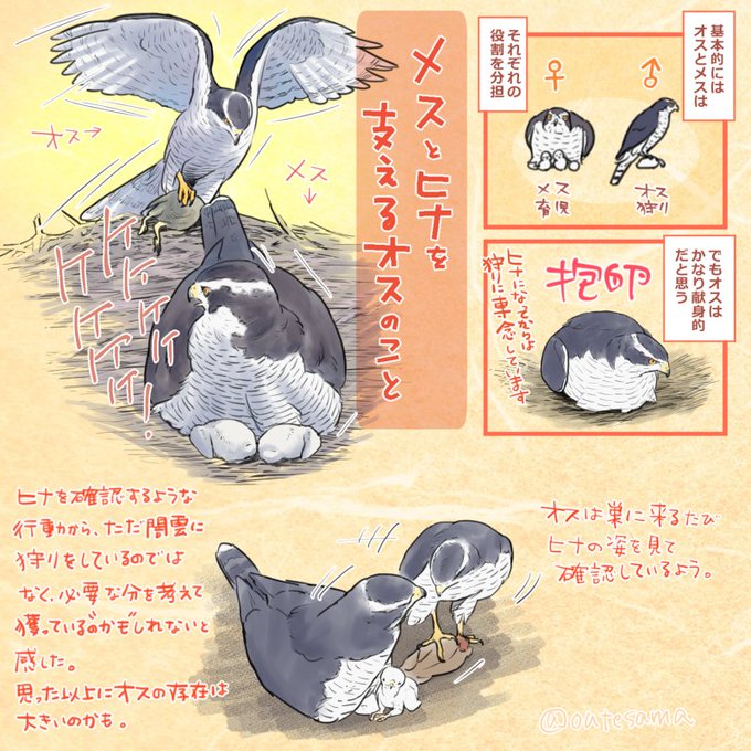 190 651 伊吹山のイヌワシをライブカメラで見ていて、あの父親は非常に優秀だとわたしは思っています。 巣だけを映すライブカメラで、出番の少ないオスの評価は低くなりがちだと感じているのですが、それはヒナにとっても同じだとオオタカで感じた一件を、以前描いて公開していなかった漫画で投下 23/04/27 20:30