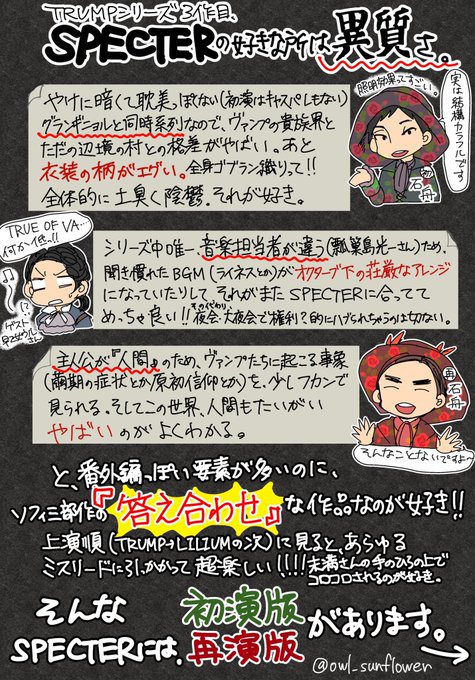 #はじめての繭期2020 、今日は #SPECTER なので、個人的にSPECTERの好きなところをいくつかと、めっちゃざっくりですが初演と再演の違いを描きました。はじ繭もCS放送も都合がつかず円盤をどちらか買いたい!という場合はキャスパレ含む追加演出や画質音響のいい再演がオススメだけど、最近配信で→
