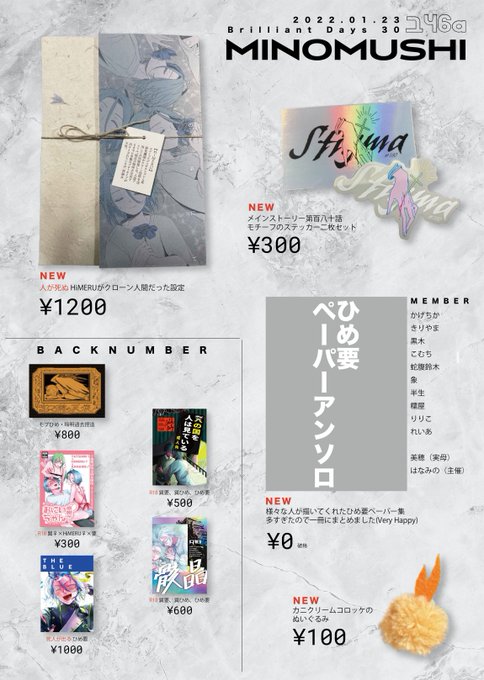 20 49 1/23ブリデおしながきです。 当日わたしと売り子どっちもコスプレです。 リプ欄に新作情報のツイートなどぶらさげておきます。 どうぞよろしく 22/01/21 23:01